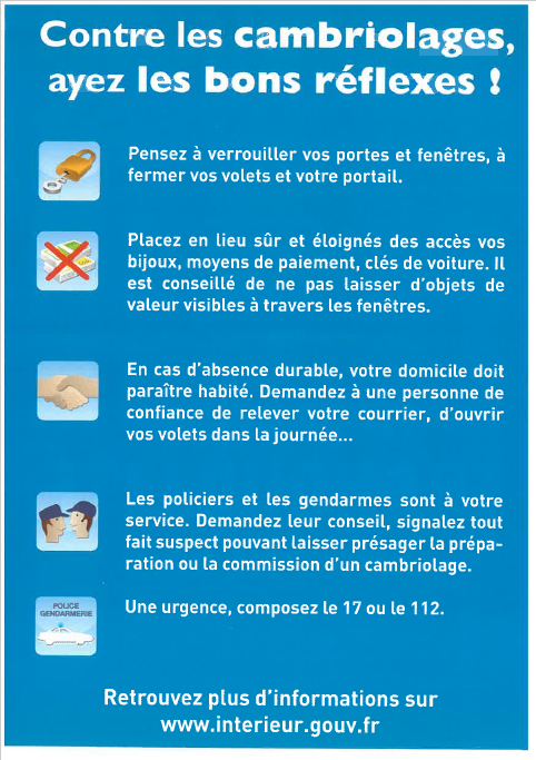 Que vous quittiez votre domicile ou que vous soyez chez vous, il est indispensable de fermer la porte à clé et d’être vigilant sur tous les accès. Il faut également veiller à ne pas laisser des objets de valeur, ou des choses qui en contiennent, trop visibles de l’extérieur comme de l’intérieur. Enfin, ne laissez pas une personne inconnue entrer chez vous. Il existe plusieurs moyens de vérifier l’identité des visiteurs, qui interviennent à titre professionnel notamment, si vous avez le moindre doute ou que les visites interviennent par surprise.